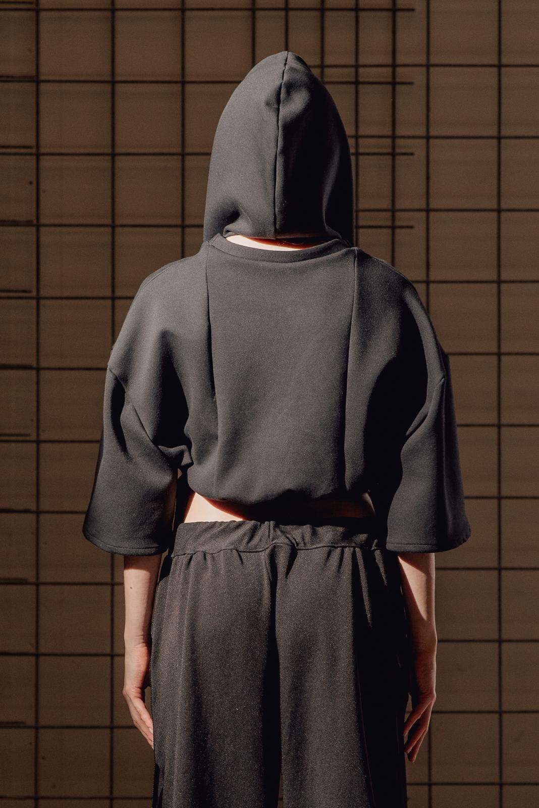 [wide-fitting cropped t-shirt designed with geometric signature construction